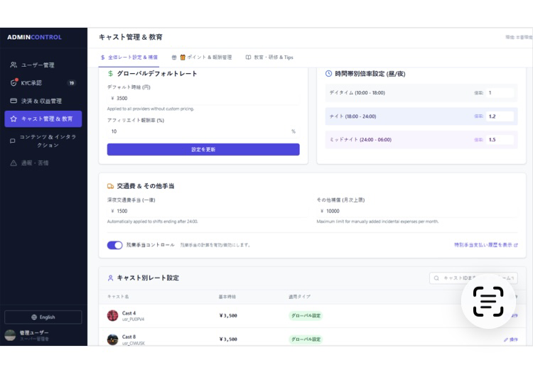 マッチング料、チップ、紹介料の自動集計と精算管理。
